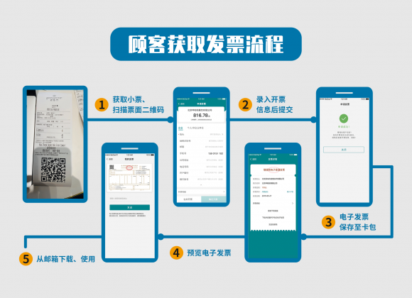顾客扫码获取电子发票后,支持将电子发票发送至指定邮箱或一键添加至微信卡包,保存、查看、使用更加便捷。