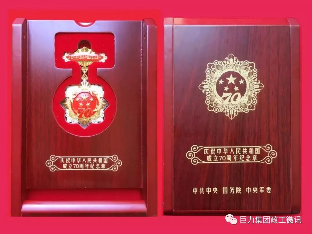 巨力集团党委书记、董事长杨建忠荣获 “庆祝中华人民共和国成立70周年”纪念章 在中华人民共和国成立70周年来临之际,巨力集团党委书记、董事长杨建忠同志荣获由中共中央、国务院、中央军委颁发的“庆祝中华人民共和国成立70周年纪念章”。 “庆祝中华人民共和国成立70周年”纪念章,是表彰70年来为中国特色社会主义伟大事业建设做出重要贡献者,是新中国成立70周年系列庆祝活动的重要组成部分。对于加强爱国主义教育,培育和践行社会主义核心价值观,增强中国特色社会主义伟大事业凝聚力和感召力,具有十分重要的意义。