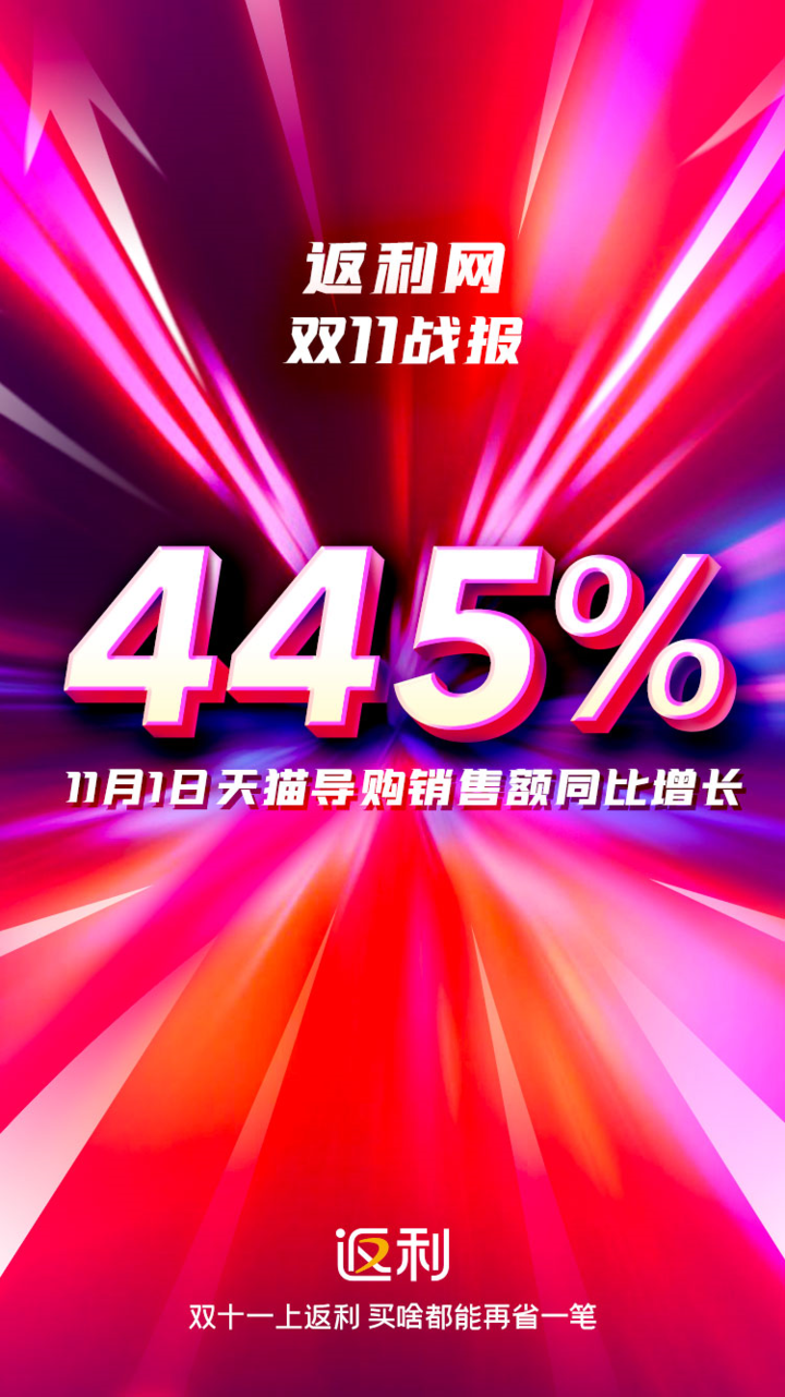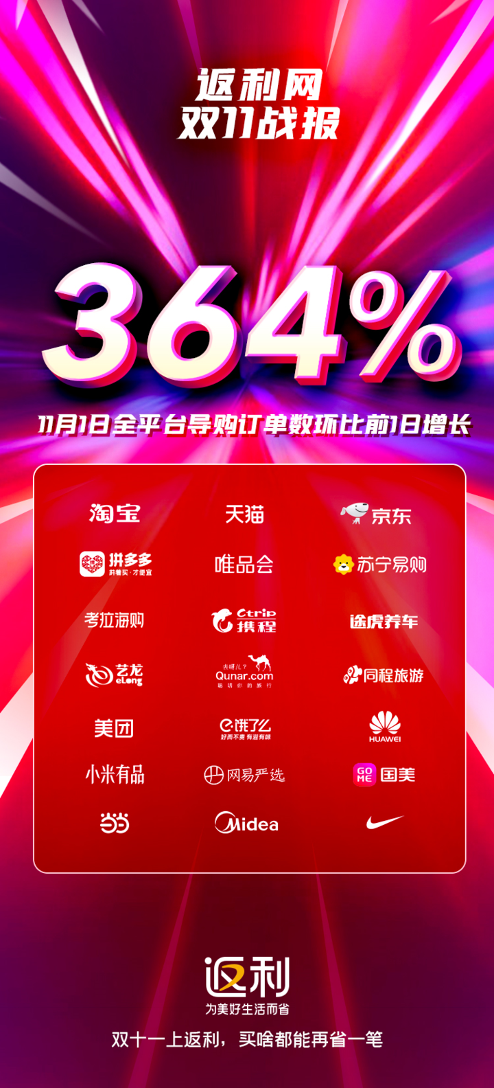消费日报网讯 11月2日,返利网宣布。1日返利网全平台导购订单数环比前1日增长364%,返利网天猫导购销售额同比增长445%。