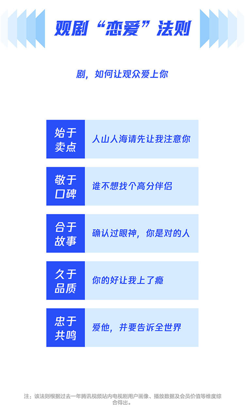 通过多维度的数据分析以及深刻的用户洞察,腾讯视频结合平台的运营经验,在今年的年度指数报告中提出了剧集突围的行业法则——观剧“恋爱”法则,即观众对优质内容大多始于卖点、敬于口碑、合于故事、久于品质、忠于共鸣,深入剧集创作的各个环节与细节才能赢得用户的青睐。同时,名场面与预告片成为“种草”剧集的双利刃,吸引九成用户去观看全片。