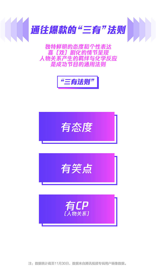 直面圈层用户需求,爆款节目的打造没有固定的公式,但却有通用的法则。腾讯视频在指数报告中将其总结为通用“三有法则”:有态度,有笑点,有CP(人物关系),即独特鲜明的态度和个性表达、喜(戏)剧化的情节呈现、人物关系产生的羁绊与化学反应,这些是节目的看点所在,更是一档节目成功的重要因素。