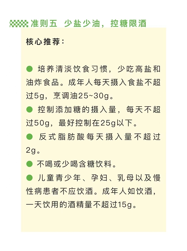 在《中国居民膳食指南(2022)》中,八大基本准则有两条都包含“不喝或少喝含糖饮料”的具体要求。其中,在“少油少盐,控糖限酒”的准则中强调应“控制添加糖的摄入量,每天不超过50g,最好控制在25g以下”,这与世界卫生组织的建议糖摄入量相一致。