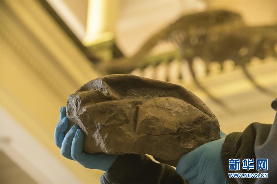 这是在智利国家自然历史博物馆展示的一块2011年在南极西摩岛发现的化石。 由智利和美国科学家联合开展、日前发表在英国《自然》杂志上的一项研究确认,一块2011年在南极洲发现的化石是白垩纪“海洋霸主”沧龙的蛋化石。 新华社发