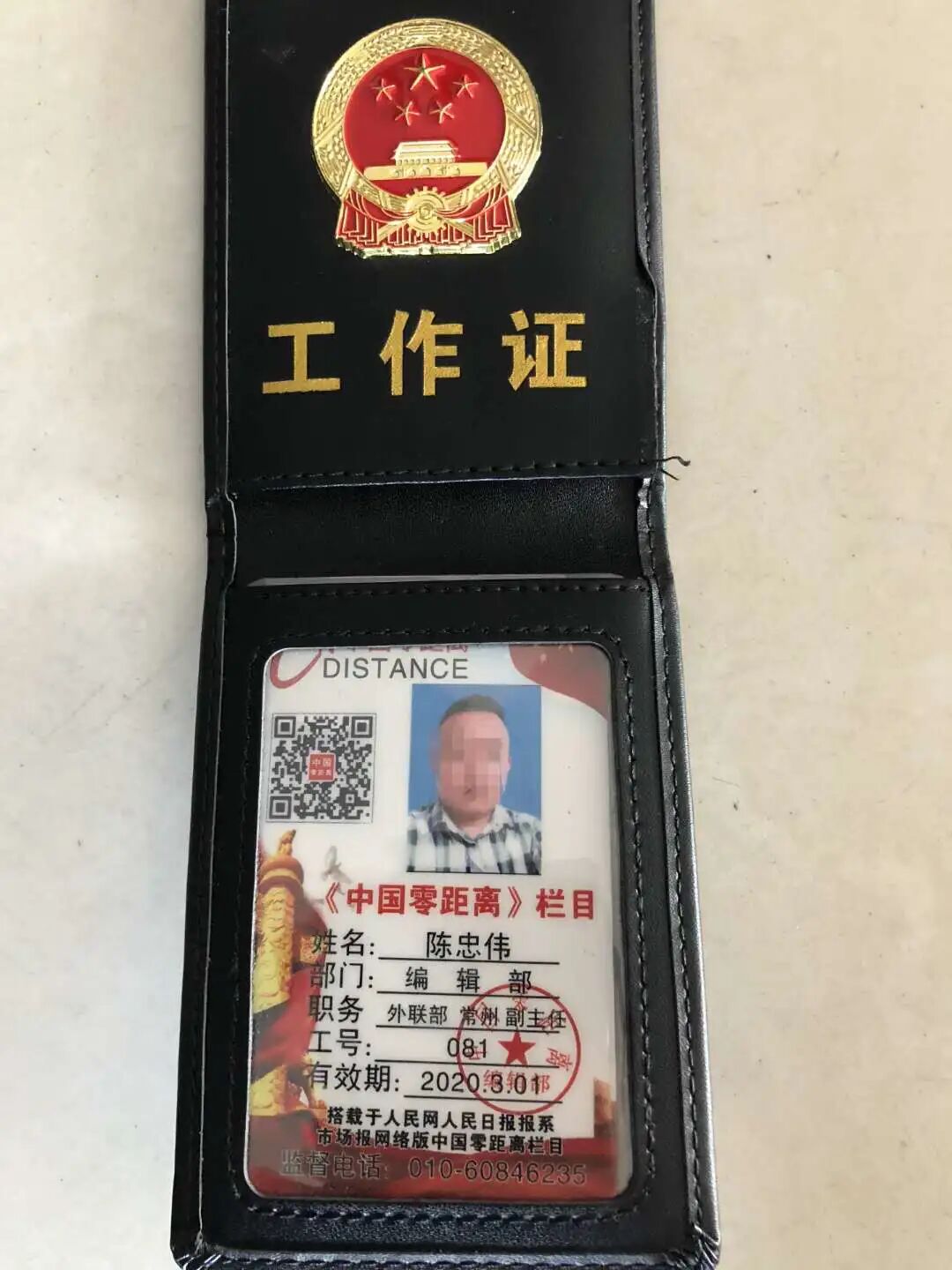 来到企业,韦广帆看到,3人驾驶的是一辆白色凯越轿车,车身副驾驶一侧喷有“人民日报社市场报中国零距离栏目”字样,挡风玻璃下还有一块铜牌,上面有“新闻采访”和“人民日报市场报”字样。见有民警到来,对方主动掏出工作证。工作证上贴有照片,印有“《中国零距离》栏目”字样,并标有姓名、部门、职务、工号、有效期、监督电话,最下方还有两行小字——“搭载于人民网人民日报报系市场报网络版中国零距离栏目”。工作证一侧还有一个二维码,对方告诉韦广帆,手机扫描二维码,就可核实其身份。