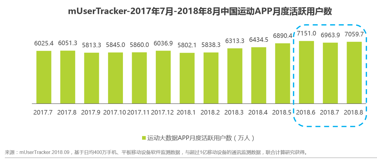 根据艾瑞咨询mUserTracker监测显示,2018年6月运动大数据APP月活跃用户已达到7100万,用户对于健康重要性的认知升级,运动大数据行业中不断推出的智能装备以及APP数据功能持续的完善均成为行业活跃用户规模持续增长的原因。
