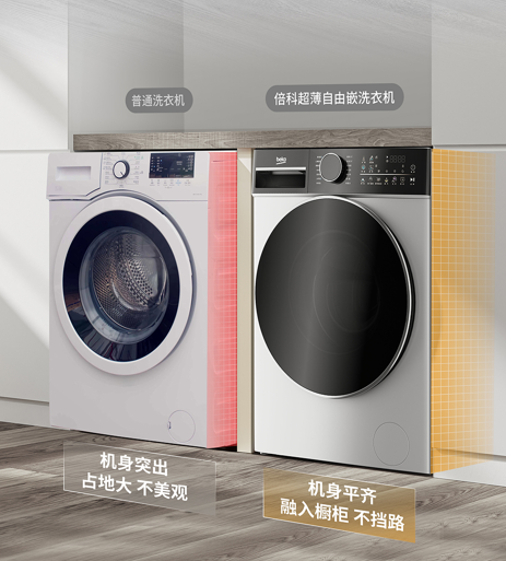 倍科至爱系列超薄彩屏自由嵌洗干一体机主打超薄设计,机身厚度仅为553mm,这个厚度能更轻松的嵌入深度600mm的标准定制橱柜。这一设计解决了传统洗干一体机笨重的外观局限,让家电也能和家居环境进行一个融合,这不仅能节省屋子里的空间,还提升整体家居美感。
