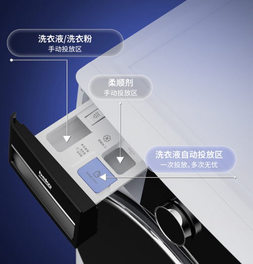 倍科至爱系列超薄彩屏自由嵌洗干一体机采用全息触控彩屏,操作界面直观易懂。配有手动/自动双重投放系统,可以通过机器的自动检测、按照合适顺序适量投放洗衣液,自动投放区的容量是650ml,能连续使用几个月。同时,针对柔顺剂也有投放区。让一种科学的方式帮我们解决日常把控不好投放量的问题。