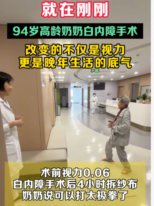 视频中的苑奶奶来自四川,今年已94岁高龄。近三年来,她饱受白内障困扰,双眼视力持续下降至0.06,生活自理困难。作为一名太极拳爱好者,视力丧失让她的生活失去重心。