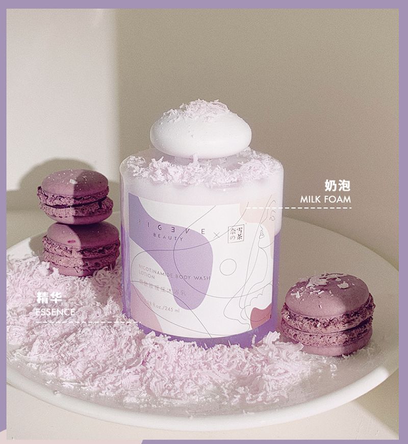 除了国外品牌之外,国内品牌也没有落下跨界潮流。近日,国内新锐红人品牌BIGEVE BEAUTY推出了限定产品,据悉,该系列限定产品是与奈雪的茶进行跨界联名,包含了烟酰胺摇摇沐浴露、镁光灯身体磨砂膏以及特别款的小奶盖洗面奶3款单品。