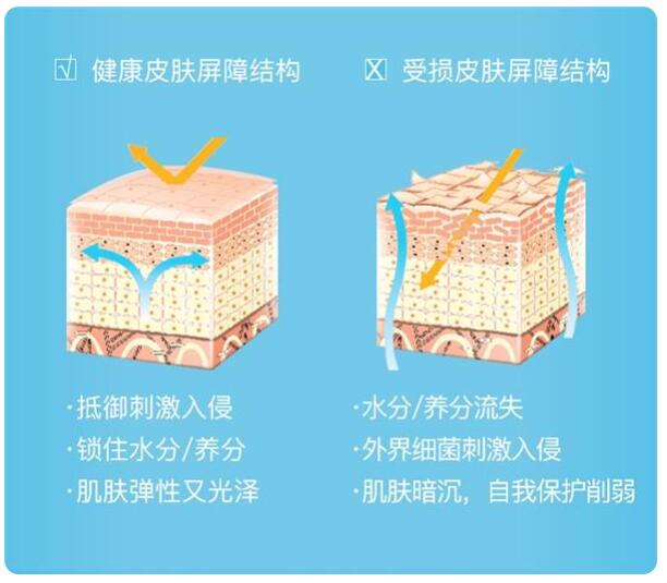 皮肤屏障是肌肤的天然保护卫士,一旦受损,皮肤锁水功能、抵御外界刺激和微生物的能力就会被削弱,容易引起皮肤干燥紧绷、敏感泛红、红血丝等问题。同时,皮肤表面细菌更容易滋生,自身清洁能力下降后,又进一步诱发痘痘的出现。
