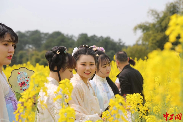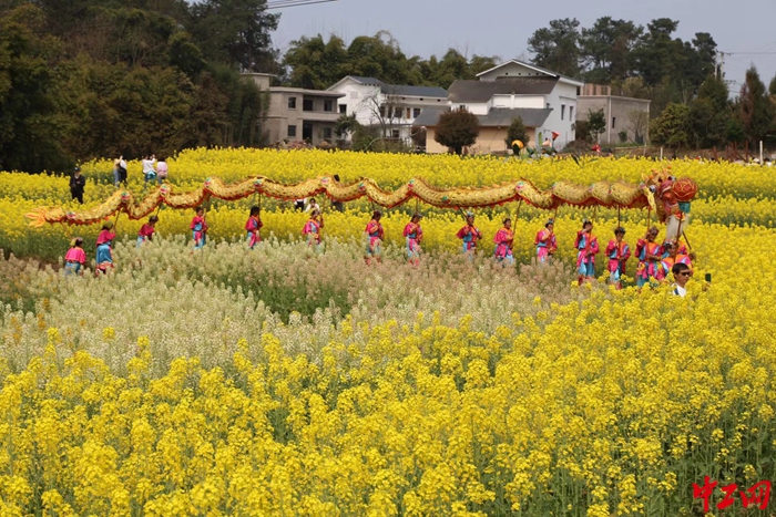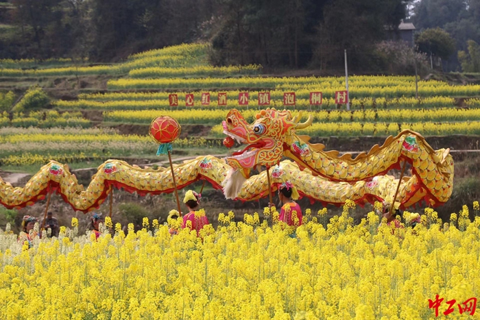 中工网讯(工人日报—中工网记者 李国 通讯员 邓银银)3月12日,在重庆市涪陵区蔺市街道泡桐村,当地的村民们在菜花地里舞龙迎客,热闹非凡。