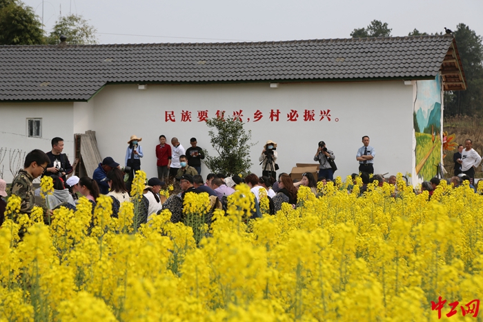 油菜花田周围的墙上写着“民族要复兴,乡村必振兴”