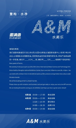 第十四届上海国际水处理展览会(净水)作为上海国际水展三大主题之一,于2021年6月2日-4日在上海国家会展中心再度拉开帷幕。该展会是净水行业标杆性展会,汇集800+优质企业,为观众提供净水行业全产业链产品、技术与服务解决方案。A&M水美乐受邀成为参展企业的一员,将在现场带来不一样的产品、观点和思路。