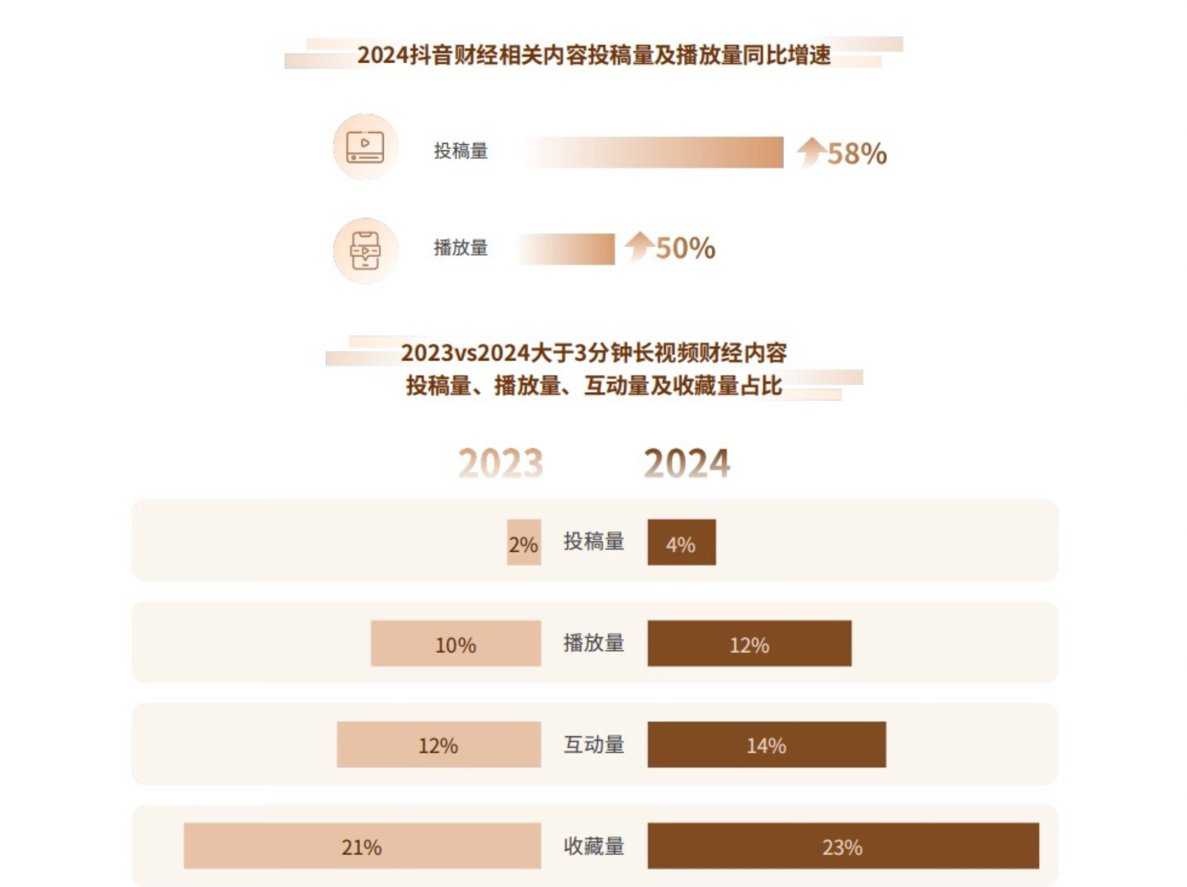 庞大的用户需求、活跃的市场环境,使抖音财经内容成为一片值得创作者深耕的沃土。报告显示,2024年抖音财经内容投稿量及播放量增速58%、50%,内容总量与热度持续扩大。在不断增长的内容生态中,大于3分钟的中长财经视频投稿、播放、互动与收藏占比在抖音获得了更优表现。