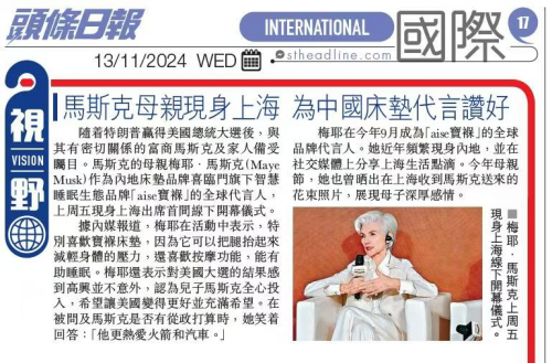 东南亚最具影响力的华文媒体——新加坡《联合早报》报道,特斯拉创始人马斯克的母亲梅耶·马斯克,在近期现身上海参加某品牌床垫活动,并大谈传奇的人生经历和埃隆·马斯克最新动向。