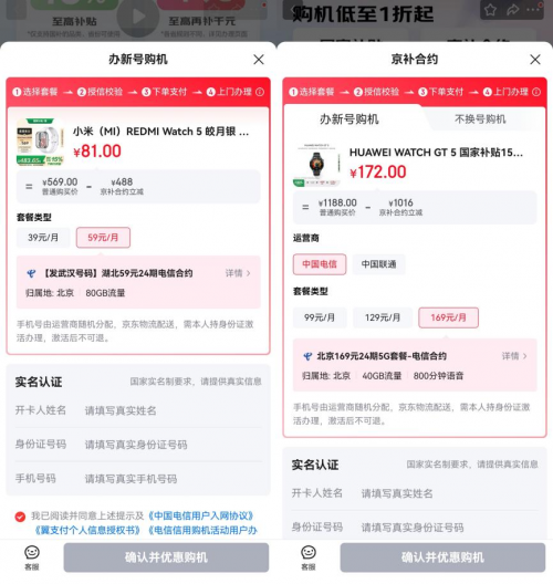 不止手机,通过“京补合约”还可以下单智能手表、云台相机、智能屏、学习机等3C数码产品。购买REDMI Watch 5 皎月银,可办理湖北59元24期电信套餐,享“京补合约”立减488元,到手价81元,套餐含80GB流量,新号卡为武汉号码。北京消费者购买华为WATCH GT 5可办理北京电信169元24期5G套餐,享“京补合约”立减1016元,到手价172元,套餐含40GB流量和800分钟语音。