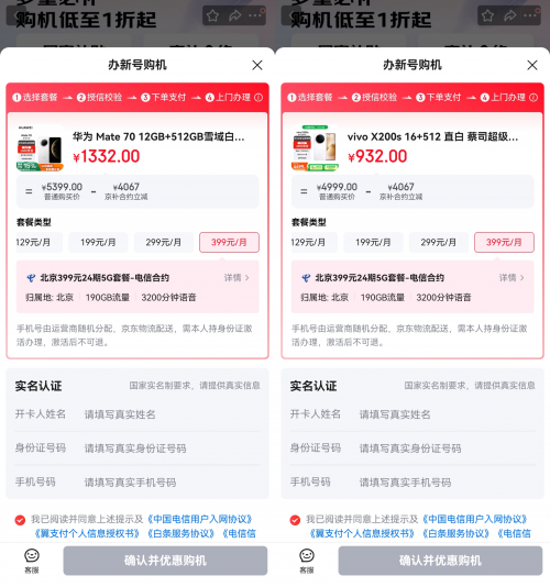 北京地区消费者办理当地电信399元24期5G套餐,享“京补合约”立减4067元,华为 Mate 70 12GB+512GB到手价1332元,vivo X200s 16GB+512GB到手价932元,套餐含190GB流量和3200分钟语音。