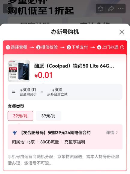 此外,想要购买备用机或给家里老人购机,可以入手酷派(Coolpad)锋尚50 Lite 64G,可办理安徽39元24期电信套餐,享“京补合约”立减300元,到手价0.01元,套餐含80GB流量,新号卡为合肥号码。