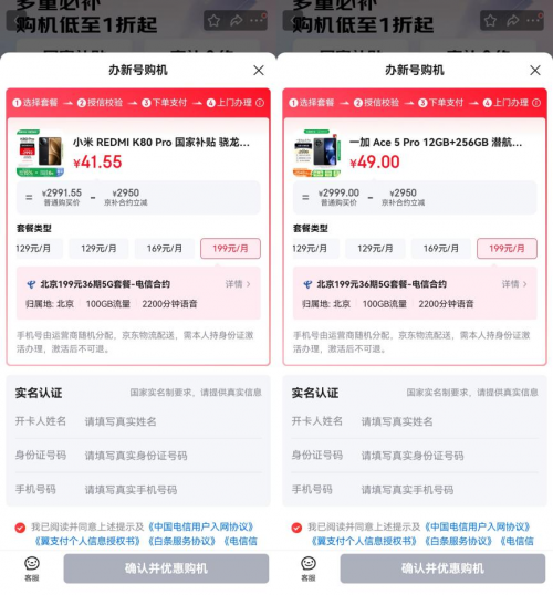 北京消费者办理当地电信199元36期5G套餐,享“京补合约”立减2950元,REDMI K80 Pro 12GB+512GB到手价41.55元,一加 Ace 5 Pro 12GB+256GB到手价49元,套餐含100GB流量和2200分钟语音。