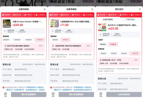 北京消费者购买大疆 DJI Osmo Pocket 3 标准版,可办理北京电信199元36期5G套餐,享“京补合约”立减2950元,到手价549元。消费者购买小度智能屏X9Pro,可办理湖北59元24期电信套餐,享“京补合约”立减488元,到手价71元,套餐含80GB流量,新号卡为武汉号码。北京消费者购买科大讯飞人工智能学习机P30 6+256GB,可办理北京联通199元36期套餐,享“京补合约”立减2340元,到手价423元,套餐含80GB流量和1000分钟语音。