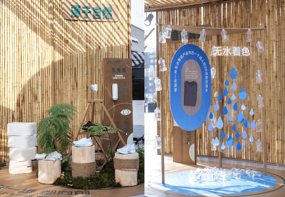 此次李宁Nature自然空间将环保产品的“全链路”可视化,打造了「源于自然」、「自然而染」、「自然新生」、「回归自然」四大主要场景与板块。