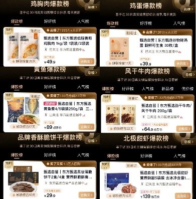 值得一提的是,东方甄选自营品中的烤肠、冷冻青虾仁、低脂香煎鸡胸肉、谷物鲜鸡蛋、黄鱼鳌、风干牛肉、北极甜虾、黑谷薄脆饼干、汉川鲜藕粉、无糖苏打气泡水、三文鱼排、库尔勒香梨等十几款产品,一举夺得抖音商城爆款榜、好评榜、人气榜三料冠军,其王牌产品自营烤肠更是显示蝉联冠军长达30天,这也意味着东方甄选的自营烤肠几乎每天、每月都处于TOP1位置,受欢迎程度可见一斑。