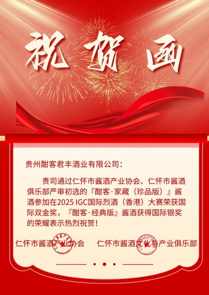 仁怀市酱酒产业协会特别向酣客君丰致贺信,并盛赞酣客君丰“以极致品质诠释核心产区标杆,为酱香出海注入强劲动能”。