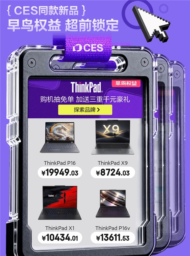 京东不仅是科技趋势的传播者,更是尖端3C数码产品抵达消费者的第一站。本届CES展出的多款重磅新品,包括多品牌最新AI笔记本、玄景M6模块化AR眼镜、XREAL 1S空间计算眼镜等前沿科技产品,都将在京东开启“全球首发”或“超前预约”,让中国消费者第一时间与世界同步体验最新科技成果。活动期间,用户还可参与1元购买重磅早鸟权益包,成功购买并登记后,可获得包含实用键盘鼠标、京东E卡及电脑双肩包等在内的超值好礼。其中,购买ThinkPad、雷神、机械师指定2026年新品,可享受专属早鸟权益:购买ThinkPad指定机型可参与抽免单大奖,并获赠LTE无线伴侣、Thinkplus 140W锋行者电源及五年无忧保;购买雷神、机械师指定新款电脑可享抽五折、抽2000元e卡特权,送鼠垫套装。