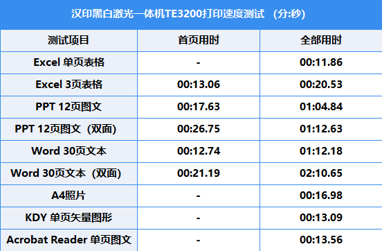 除了5万页的耐用性测试外,我们更换了一套全新的硒鼓耗材,对汉印黑白激光一体机TE3200进行了标准的打印速度测试,具体请看下表: