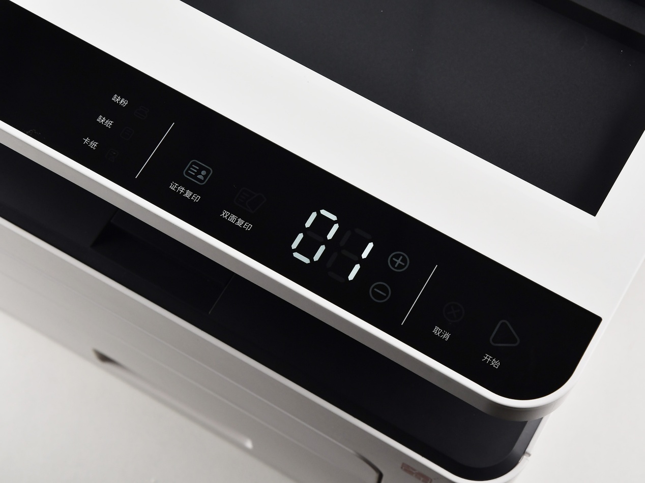 在机身中部为该产品的出纸单元,因采用了黑色配色,让用户可以很好的识别出打印文档,较大概率上避免了打印后错拿忘拿的可能性。