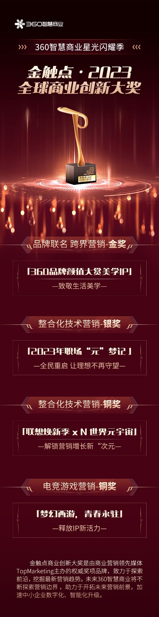 金触点商业创新大奖是由商业营销领先媒体TopMarketing主办的权威奖项品牌,致力于探索前沿,挖掘最新营销趋势。未来360智慧商业将不断探索营销边界,助力于开拓未来营销前景,加速中小企业数字化、智能化升级。