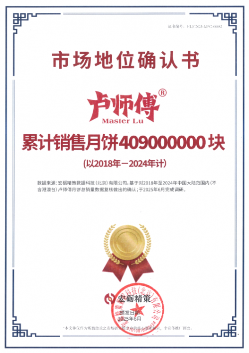 宏砺精策基于基于对2018年至2024年12月期间卢师傅月饼总销量的调研及复核做出的确认;于2025年6月完成调研。卢师傅“累计销售月饼4.09亿块”市场地位。