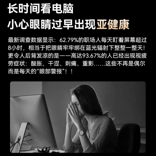 最新调研指出,超过62.79%的职场人每天面对屏幕时长已突破8小时,双眼几乎全天暴露在高强度蓝光环境中,更值得警惕的是,93.67%的人已出现不同程度的视疲劳,虚假混合的光源、流明低下昏暗的照明以及照度不均,是目前公认最容易被忽视潜伏视力的狠角色。