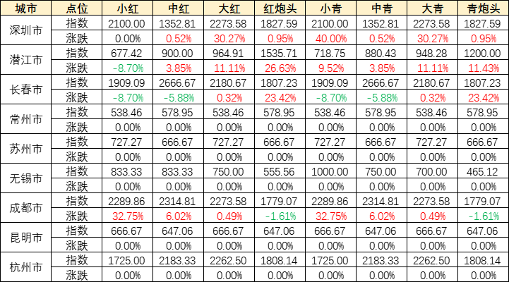 从主要销区来看,深圳小龙虾价格指数稳中有升,小青和大虾涨幅较大;潜江不同规格虾价格指数涨跌互现,大虾和炮头虾涨幅较大,小红小幅下跌;长春小龙虾价格指数涨跌互现,红炮头涨幅较大,小虾跌幅较大;成都小龙虾价格指数涨跌互现,小虾涨幅较大,炮头跌幅较大;其余城市各规格品价格保持稳定。
