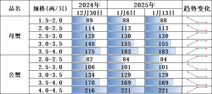 近期大闸蟹价格小幅波动,预计春节前大规格螃蟹将继续缩量,叠加春节备货,价格将回升。螃蟹产地交易方面,本期各规格价格持稳运行。截至2025年1月13日,各规格母蟹价格中3.5-4.0规格报183元/公斤;各规格公蟹价格中4.0-4.5规格报221元/公斤。