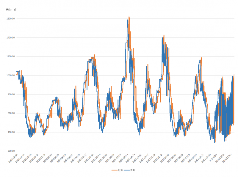 图2 红虾和青虾价格指数走势对比(单位:点)