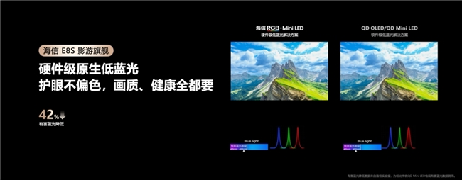 很多高端电视的"护眼模式"都是双刃剑,SQD-Mini LED通常通过软件加滤镜实现护眼,开启后画面会变得蜡黄,严重影响观影沉浸感。而海信E8S采用硬件级原生低蓝光技术,直接从LED光源的波谱入手剔除有害蓝光,相比SQD-Mini LED有害蓝光降低42%以上,真正做到"护眼不偏色"。