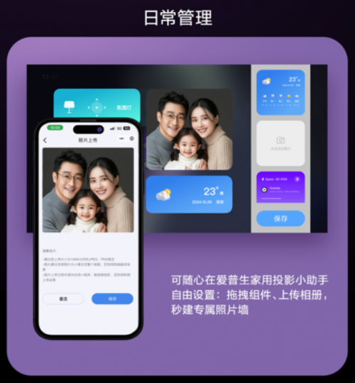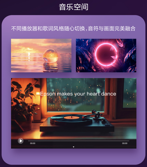 除了外置的氛围灯,爱普生EF-51还内置了音乐、氛围、观影和日常管理等不同的空间模式。打开音乐空间,连接手机蓝牙,投影机秒变音乐播放器,投影屏幕滚动的歌词宛如随乐流淌的光影诗句。氛围空间分为活力、派对、轻松、浪漫、天气五大模式,每个模式下又细分不同的场景。以天气模式为例,选择“下雨”,屏幕上出现动态的下雨场景,配合白噪音,令人感觉仿佛身处一个淅淅沥沥的雨天;选择“跟随天气”,系统会自动定位,屏幕上的场景跟随实际天气变化。影院模式中有着海量的影视资源,影院级别的画质足不出户也能享受。日常管理空间则充满生活气息,用户可以自由组合天气、音乐、照片墙等小组件,满足用户生活记录与展示的多元需求。此外,爱普生EF-51还拥有“唤醒”和“归宅”功能。只需提前设定时间,EF-51便可为你唤醒一个美好的清晨,亦或是提前开启氛围场景,在夕阳中待你归家。