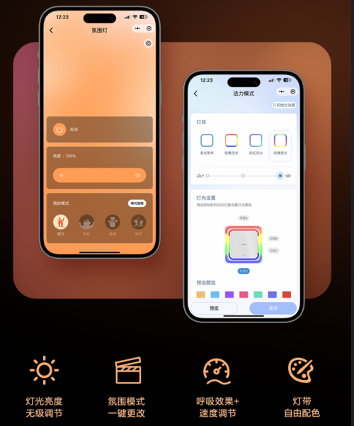 用户打开“爱普生家用投影小助手”小程序还可以对灯光的亮度和色彩等进行更为详尽的调节和设置。小程序支持远程开关、无极亮度调节和模式切换,提供四种灯效并支持灯速调节、预设灯效色彩,并可对灯带进行灵活的分区色彩设置。以活力模式为例,进入编辑模式后,有柔光常伴、轻舞流光、彩虹流水、炫舞柔光等丰富光效可供选择;用户还能对灯光的四个灯区进行单独调节,根据个人喜好自由定制颜色,星轨、极光等特色定制模式也能轻松实现,真正做到让光影随心所 “变”。