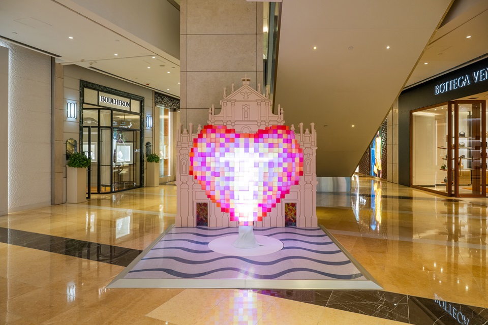 商场地面层的“心系澳门”装置由一个巨型红色爱心和仿大三巴牌坊的背景组成。这件作品透过将色彩缤纷的爱心与澳门最具代表性的历史地标并置,展现澳门作为一个多元文化城市的双重魅力,象征着中葡和东西方文化的和谐共存。