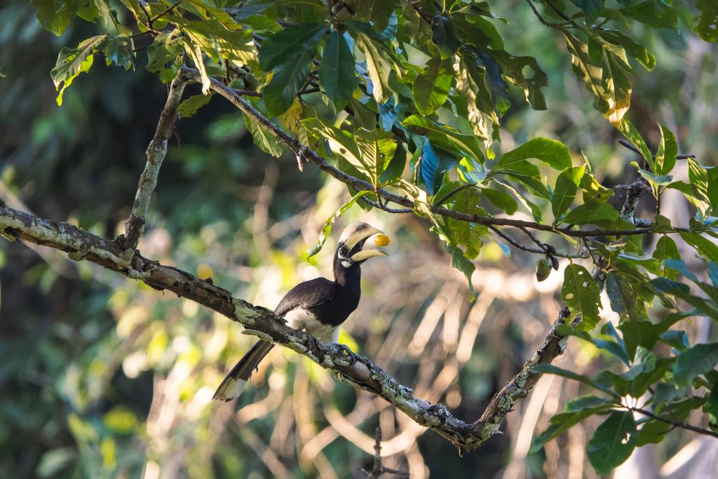 2月7日,冠斑犀鸟在盈江县太平镇石梯村的山林间吃果子。