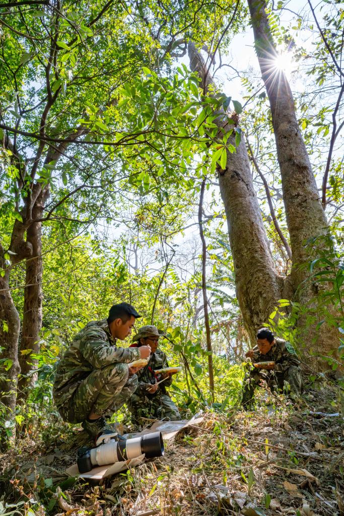 2月6日,“犀鸟巡护队”队员管能杰(左)、排忠华(中)与排新明在盈江县太平镇石梯村巡护期间吃午饭。