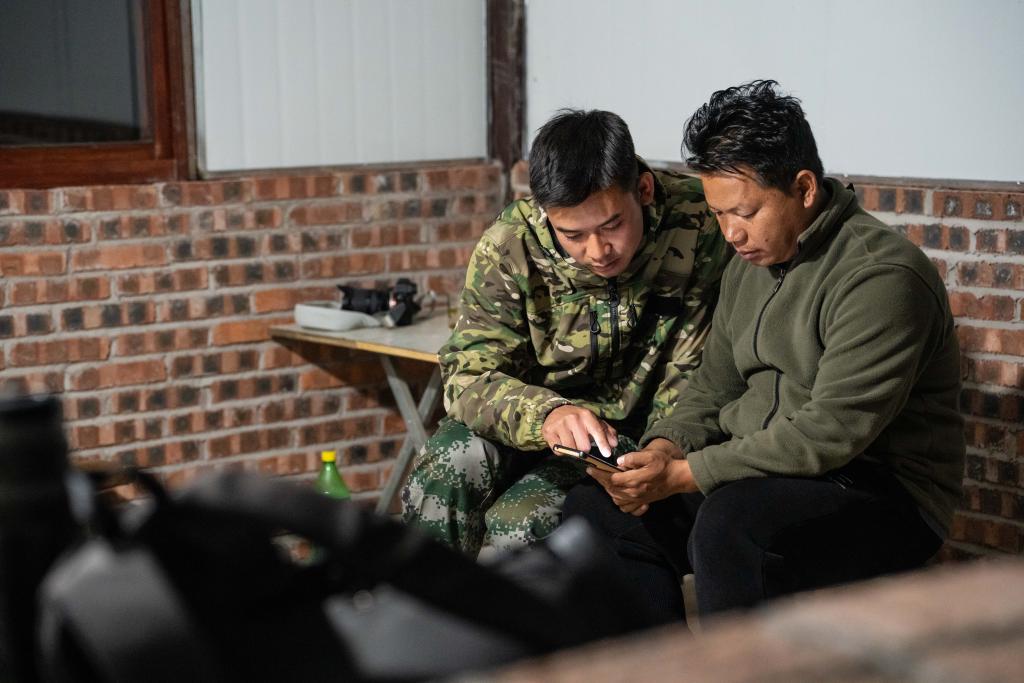 2月6日,“犀鸟巡护队”队员管能杰(左)与排忠华在盈江县太平镇石梯村一处犀鸟观测点记录犀鸟巢址。