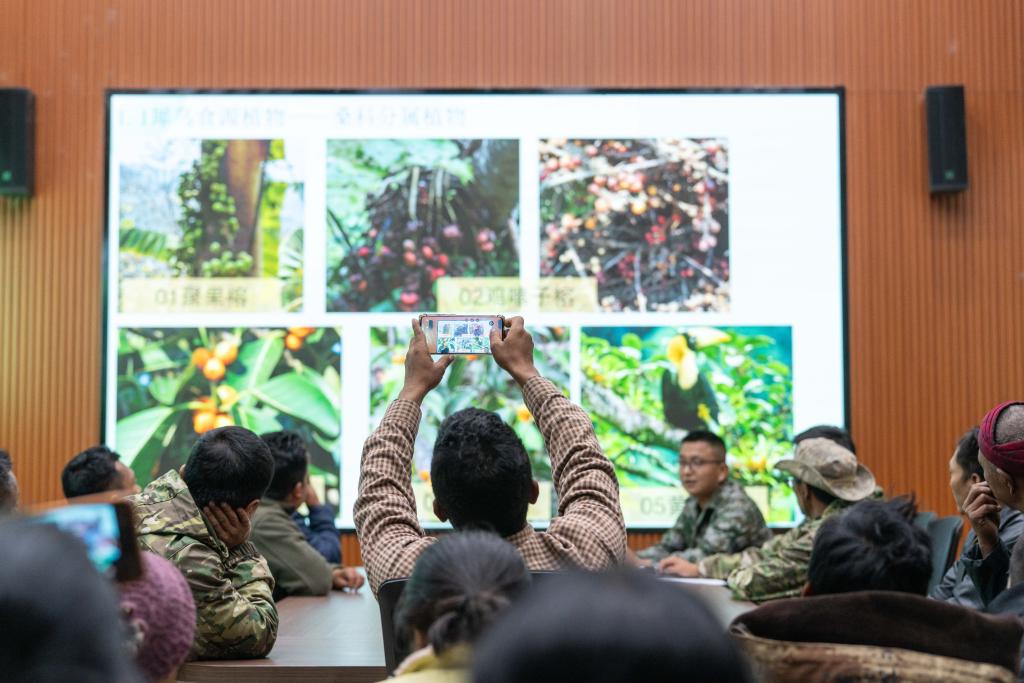 2月5日,盈江县太平镇石梯村村民在铜壁关省级自然保护区管护局组织的宣传活动上了解犀鸟食源植物知识。
