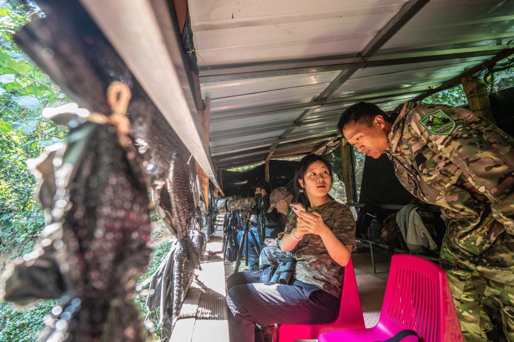 2月8日,“犀鸟巡护队”队员排新明(右)在盈江县太平镇石梯村一处鸟类观测点与游客交流。