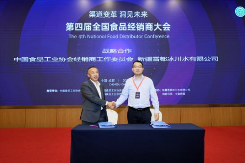 中国食品工业协会经销商工作委员会主任高金争与新疆雪都冰川水有限公司副总经理黎云签订战略合作协议