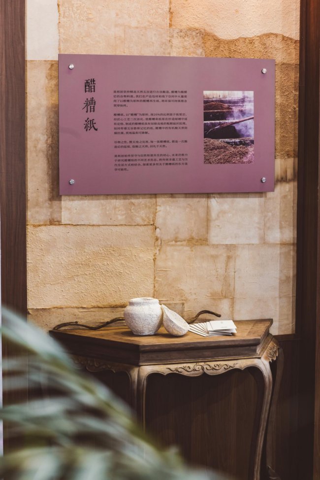 值得一提的是,美和居还以东方可持续的表达方式,从山西这片文化土壤中汲取人与生活、工艺的连接,通过醋糟纸这一介质进行艺术化演绎,品牌将传统非遗工艺与当代生活方式相联结,创造出能够连接更多消费者的产品。
