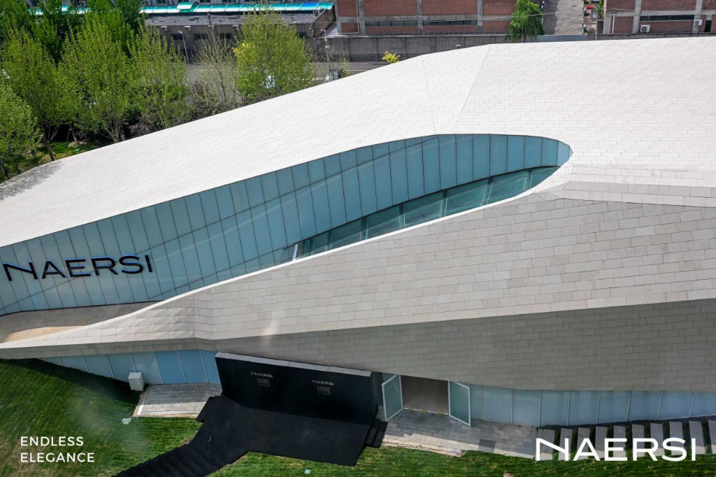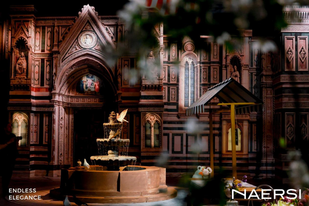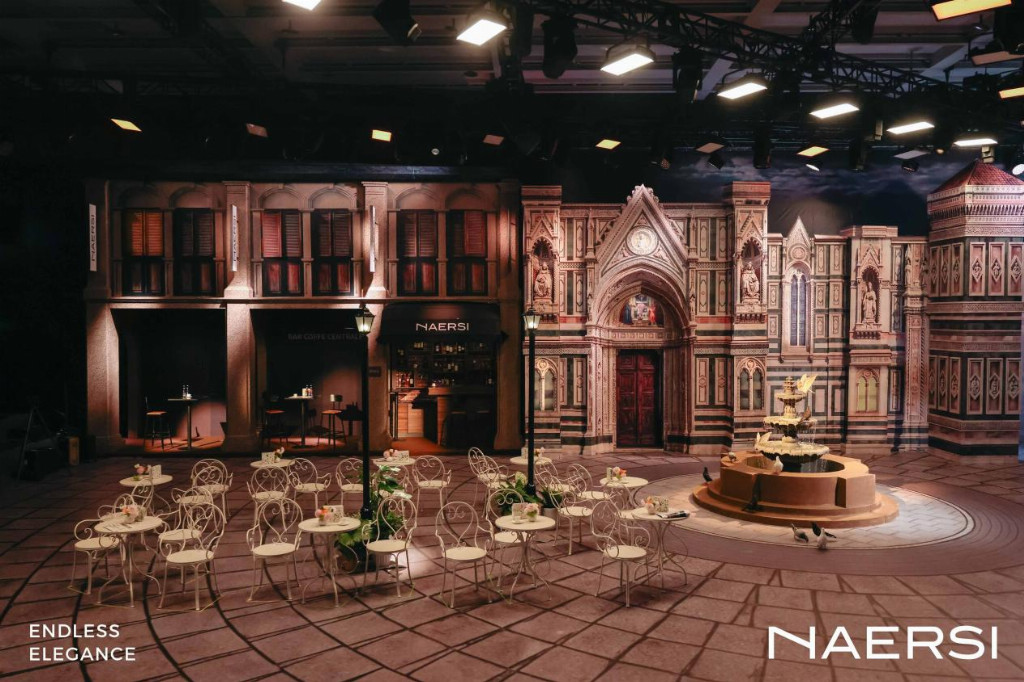大秀选址于由世界级建筑大师保罗·安德鲁概念设计的北京星地艺术中心。形如巨鲸、轻盈灵动的建筑线条,为时尚叙事提供了独特的空间语言。作为赢家时尚集团旗下的核心品牌,NAERSI此次将佛罗伦萨的文艺复兴精髓在现场华丽重现,沿秀道铺陈意式沉浸街区——名品街的优雅橱窗、圣百花大教堂的穹顶光影、街角咖啡馆的闲适气息交织呈现。这种将顶级艺术地标与品牌文化叙事深度融合的能力,体现了赢家时尚集团作为中国高端时装领军企业在资源整合与品牌运营上的雄厚实力与行业远见。