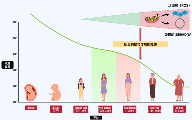 研究发现,女性出生时卵巢中约有100万至200万个原始卵泡,但随着年龄增长,卵泡数量和质量都在下降。35岁后,这种下降呈现断崖式趋势。而卵泡质量下降的核心原因,正是线粒体功能衰退。