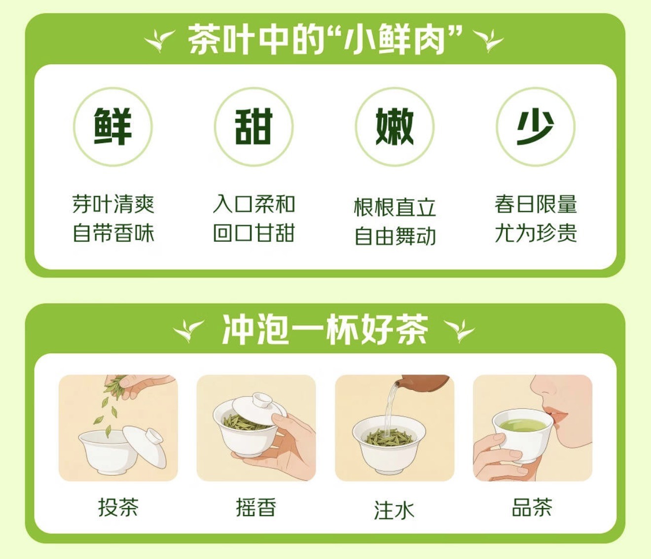 古语云“惊蛰茶脱壳,春分茶冒尖”,经过一冬的能量蓄积,明前茶树在春分前后抽出的芽叶,凝聚着整个冬天的阳光与雨露,每一片都带着初春独有的清爽与鲜活。此时的龙井,是茶叶中的“小嫩肉”,一芽一叶或两叶的茶芯完整饱满,遇水后根根直立,在杯中自由舒展,宛如春日里最灵动的风景。又由于明前气温低,茶多酚含量少,使得茶汤入口格外柔和,几乎没有苦涩,只有满满的甘醇与回味。